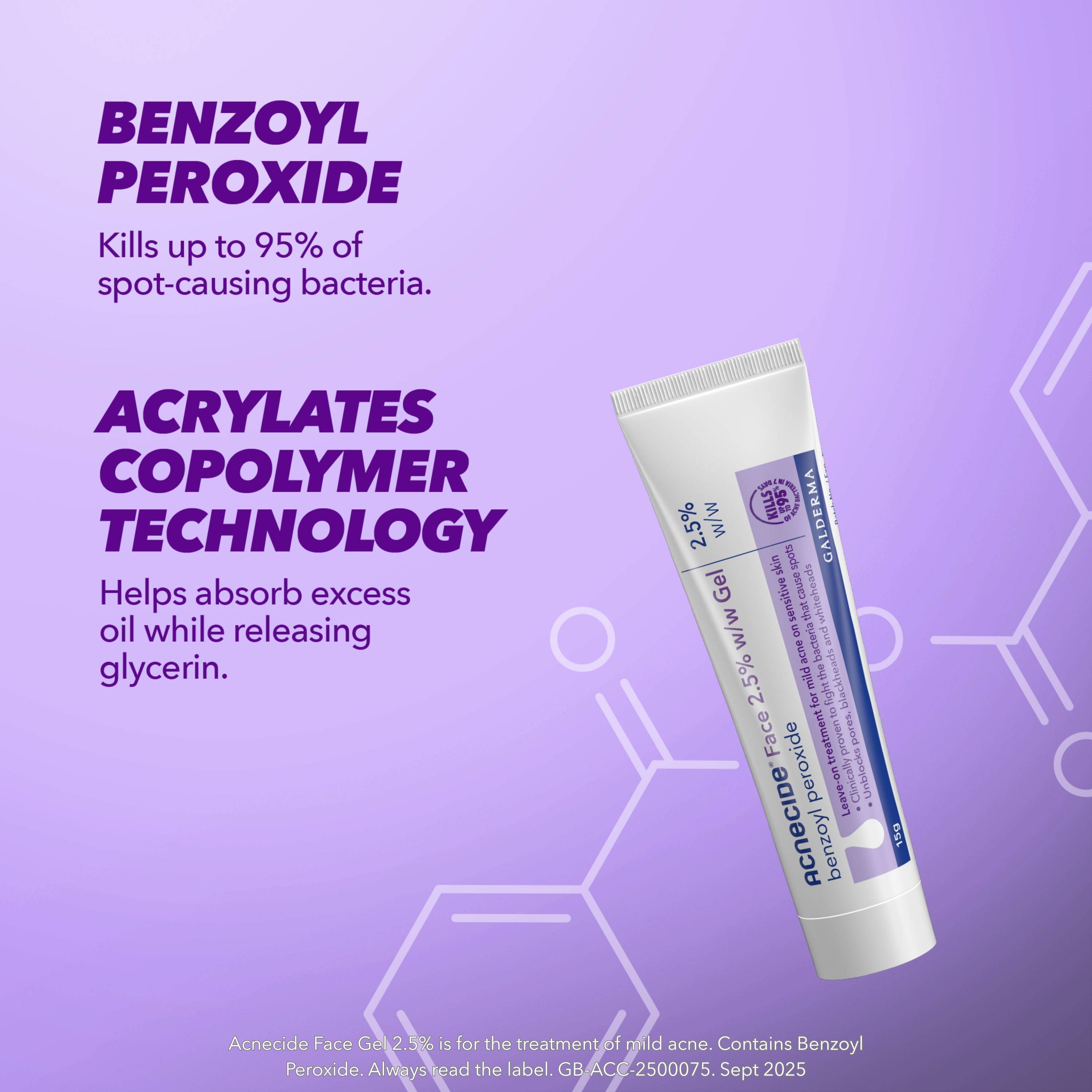 Contains the active ingredient 2.5% Benzoyl Peroxide which effectively kills up to 95% of spot-causing bacteria.